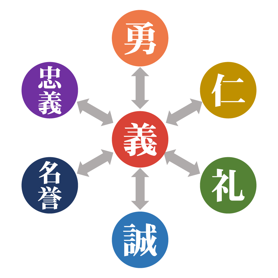 武士道の7つの徳目は、それぞれが単体ではなく、1つの連動したシステムのように繋がっています。